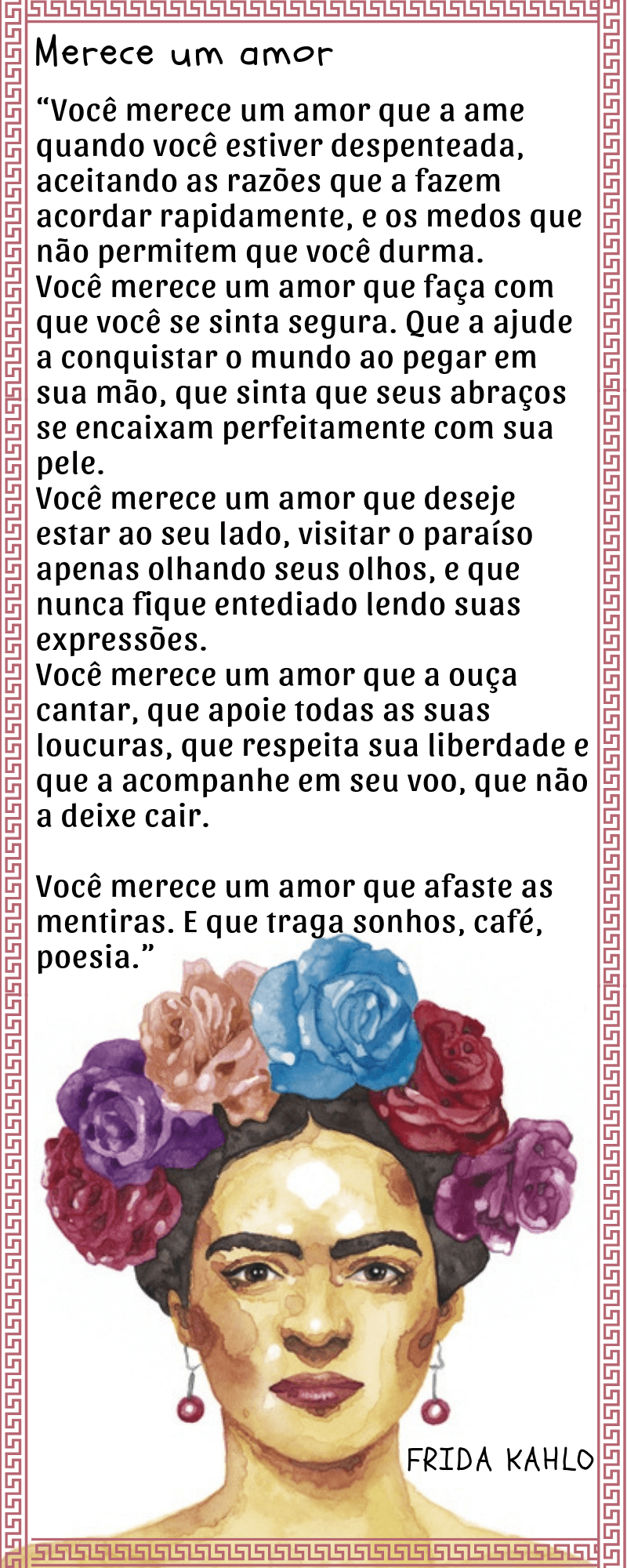 Meus amores, encontrei este poema memorável da Frida Kahlo no site SIGNIFICADO DOS SONHOS e resolvi compartilhar aqui no blog. Tenho uma admiração muito grande pelo trabalho da Frida Kahlo e este poema me encantou, não podemos exigir grandes demonstrações de amor do próximo, mas podemos reconhecer um grande amor nos pequenos gestos do dia à dia.
